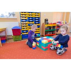 Ten zestaw kolorowych klocków z pewnością rozpali wyobraźnię każdego malucha. Ich niezwykłe gabaryty, zachęcają do zabawy i pobudzają nieograniczoną kreatywność. Można z nich konstruować niesamowite budowle nie tylko wg załączonej karty z propozycjami (domki, samoloty, roboty itp.). Klocki są bardzo lekkie mimo gigantycznych rozmiarów, gdyż wykonane są z pianki.